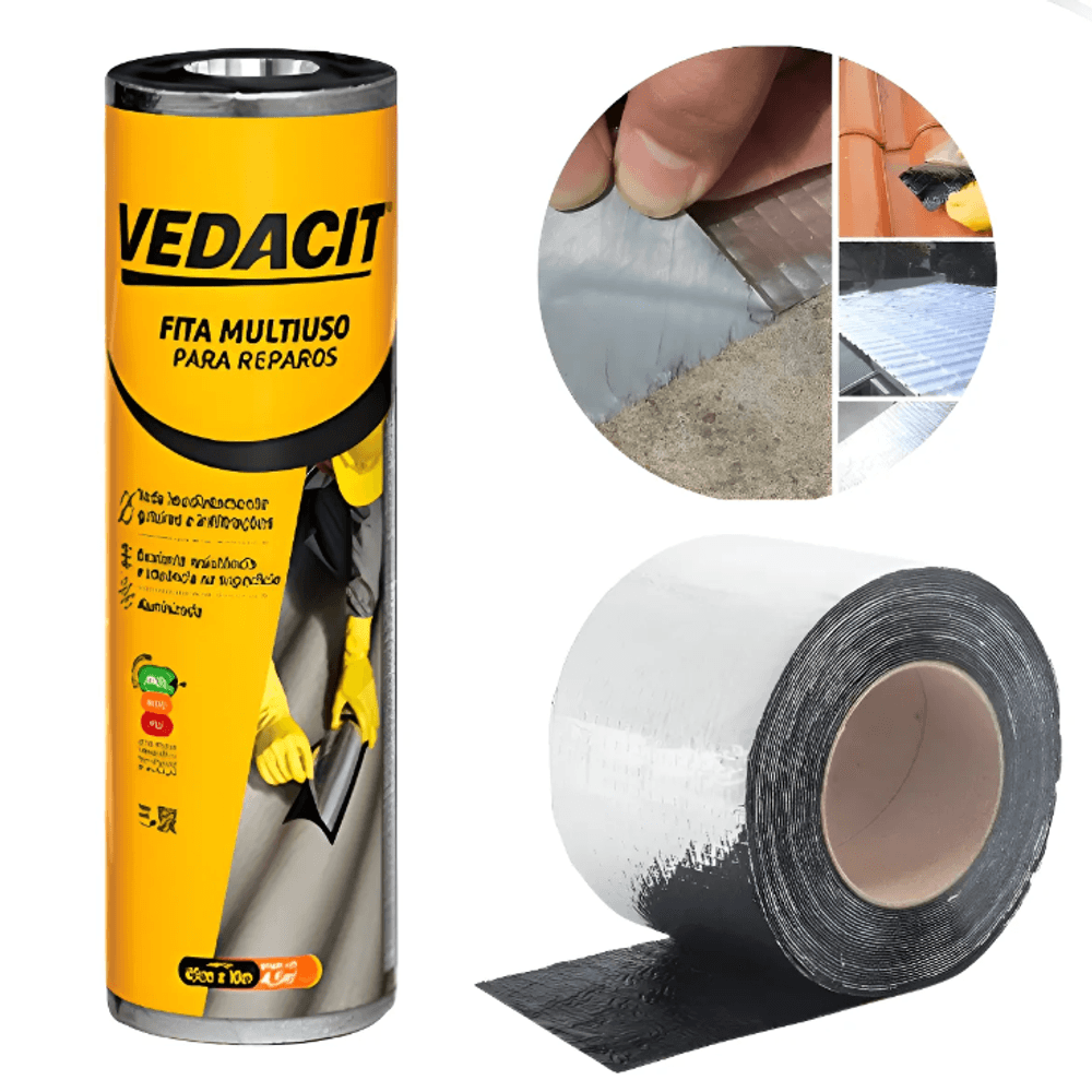 A Fita Veda Tudo é composta por asfalto modificado com polímeros, protegido em uma das faces por um filme de alumínio e na outra por um filme plástico siliconado, que é retirado no momento da aplicação.