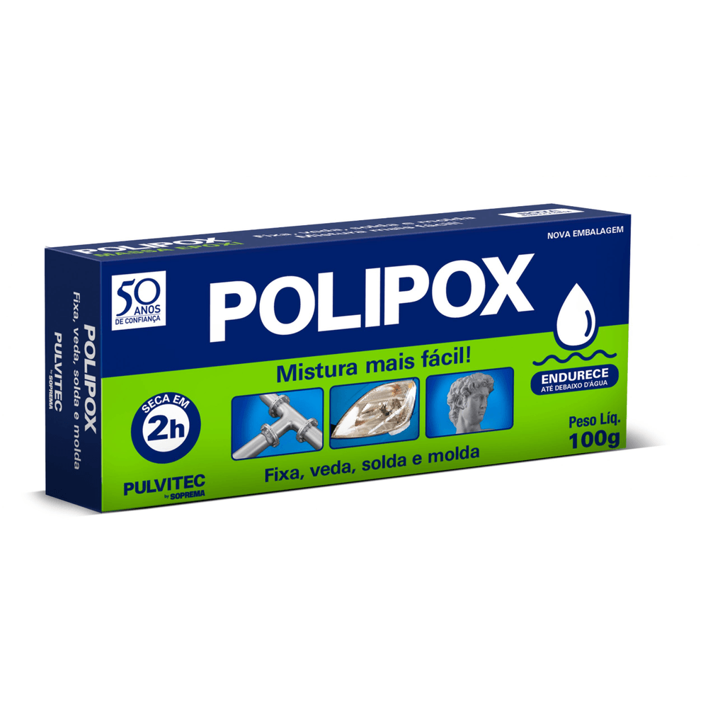 A Massa Epóxi Polipox é composta por uma resina epóxi e um endurecedor, que quando misturados, iniciam o processo de cura, resultando em uma massa rígida e de alta resistência.