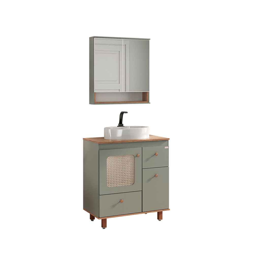 O Conjunto Júlia se destaca por proporcionar aconchego, ao incorporar materiais e cores que remetem a serenidade da natureza. A sofisticada cor Verti, harmoniza-se perfeitamente com o calor do tom amadeirado Catedral. A adição de um detalhe no gabinete em tela trançada, inspirada na palha natural, adiciona delicadeza ao design, trazendo uma sensação de leveza e nostálgica em um contexto moderno.