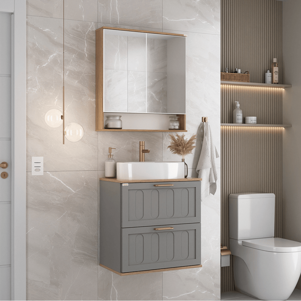 O Conjunto Gabinete de Banheiro Madeira Milena 60cm Catedral/Avelã Fabribam combina elegância, funcionalidade e design moderno para deixar seu banheiro mais bonito e organizado. Produzido em MDF de alta qualidade, possui acabamento nas cores Catedral e Avelã, que trazem um toque natural e sofisticado ao ambiente. Com 60cm de largura, o conjunto oferece ótimo aproveitamento de espaço, contando com gavetas e porta com amplo espaço interno para guardar itens de higiene e beleza com praticidade. O tampo resistente e o design contemporâneo valorizam ainda mais o visual do móvel. Ideal para quem busca um banheiro funcional, elegante e com acabamento de qualidade.