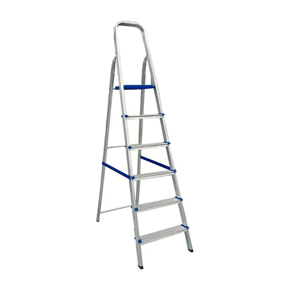 Escada de alumínio de liga especial, super resistente com degraus e sapatas antiderrapantes. Trava de segurança em alumínio com articulação lateral e sistema de sustentação traseira em X.
