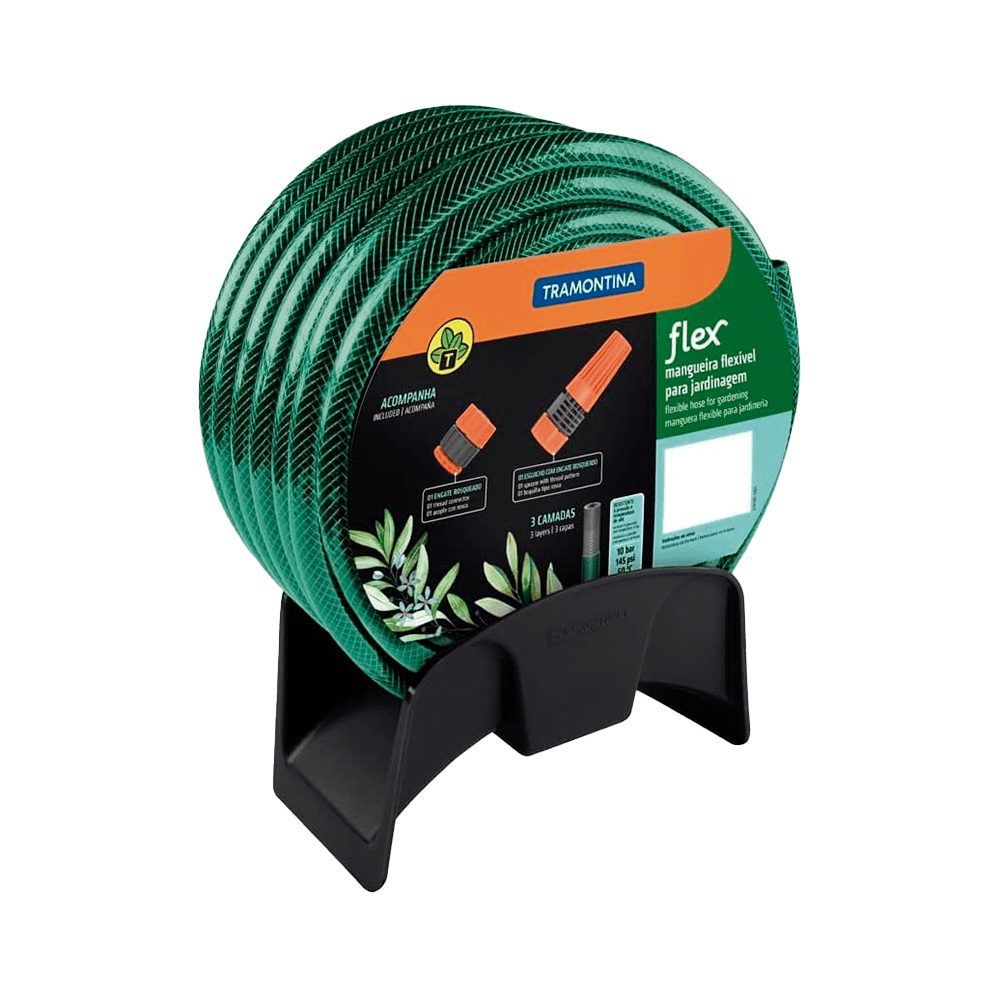 É produzida com camada exterior em PVC, camada intermediária em poliéster trançado e camada interior também em PVC, o que dá boa resistência e durabilidade à mangueira, que tem 20 metros de comprimento. Acompanha 01 esguicho com jato regulável, 01 suporte de parede e 01 adaptador com engate para torneira.