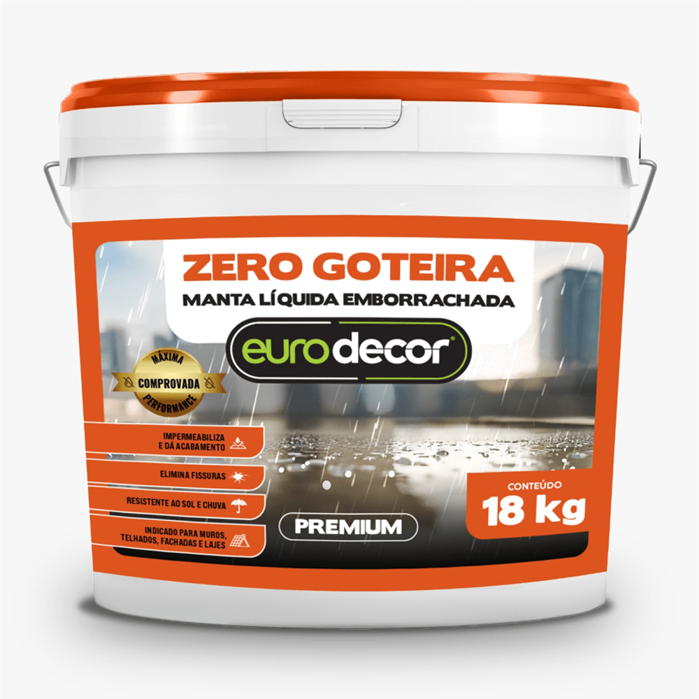A Manta Líquida Emborrachada Zero Goteira Branco de 18kg da Eurodecor é um impermeabilizante elástico desenvolvido para a proteção e vedação de coberturas contra infiltrações e goteiras. O produto se diferencia por sua tonalidade branca pura, que atua como um excelente isolante térmico por refletir a radiação solar, mantendo as superfícies mais frescas e reduzindo a temperatura nos ambientes internos. Ao secar, o material forma uma membrana emborrachada contínua que possui alta capacidade de alongamento, suportando as dilatações e contrações estruturais sem romper.