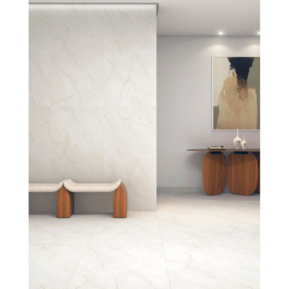O Piso Acetinado Retificado Golden Mate da Majopar, no formato 75x75 cm, é um revestimento cerâmico de luxo projetado para conferir brilho e sofisticação a ambientes internos. Sua superfície acetinada oferece segurança ao espaço e destaca os detalhes da estampa, sendo ideal para salas de estar, jantar e dormitórios. Por possuir bordas retificadas, as peças podem ser instaladas com uma junta de apenas 2mm, resultando em um acabamento mais limpo, moderno e com menor acúmulo de sujeira entre as placas.