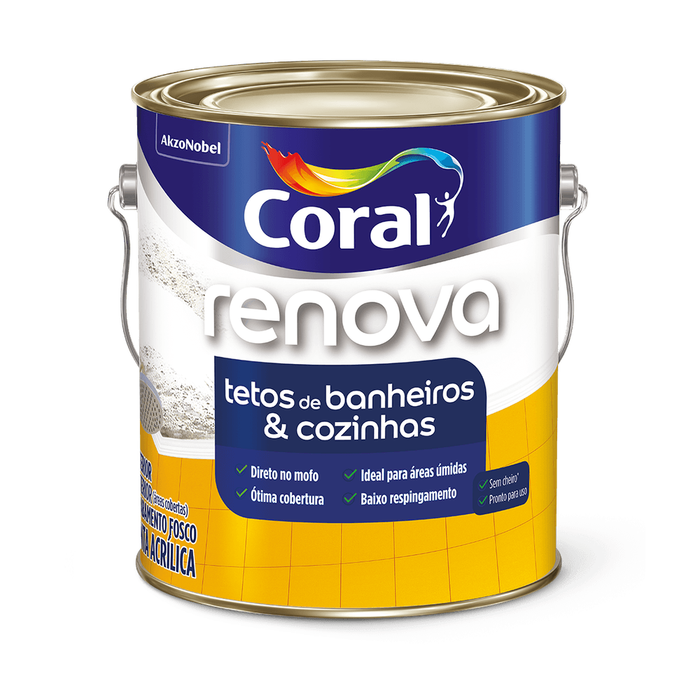 A Tinta Acrílica Renova Tetos Banheiros e Cozinhas Coral é ideal para deixar sua pintura ainda mais prática, você pode simplesmente aplicar a tinta diretamente sobre o mofo, sem limpeza prévia.Indicada para ambientes internos. Acabamento fosco.