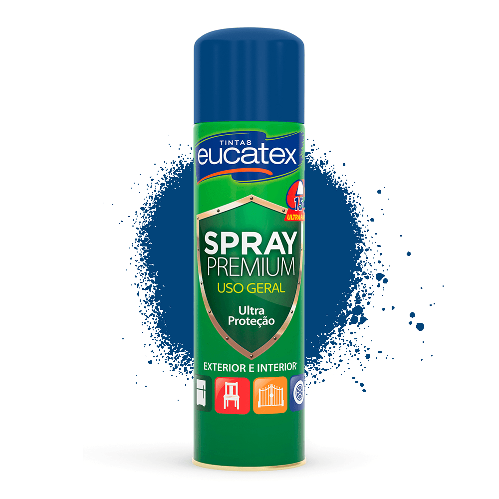 A tinta Spray Premium Multiuso azul escuro 400ml Eucatex com ultra proteção e acabamento brilhante é indicada para pintura de geladeiras, bicicletas, móveis de aço, brinquedos, objetos artesanais e decoração em geral, em ambientes externos e internos.